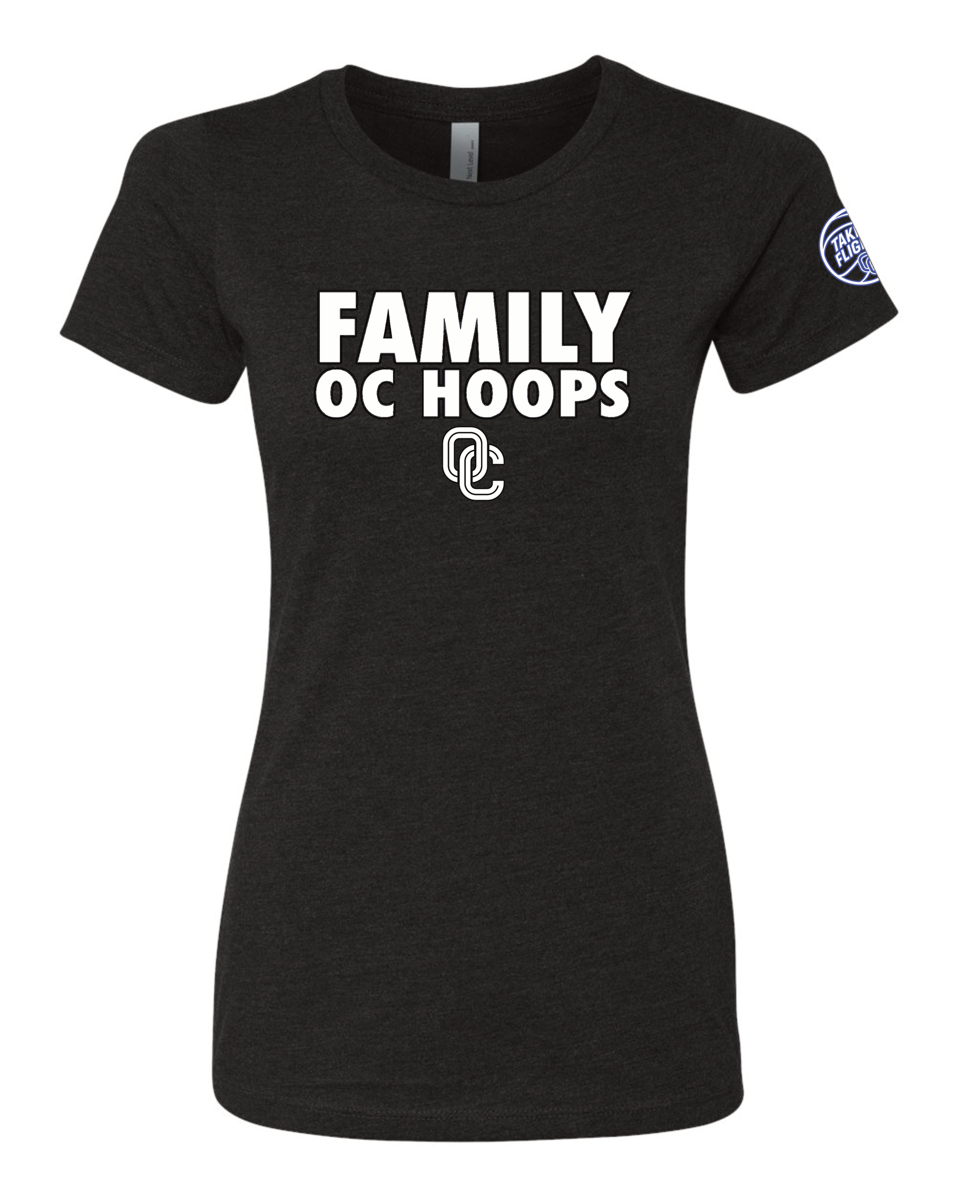 OC FAMILY Logo on the chest, OC Patch on left sleeve. Womens cut Nextlevel CVC tee.